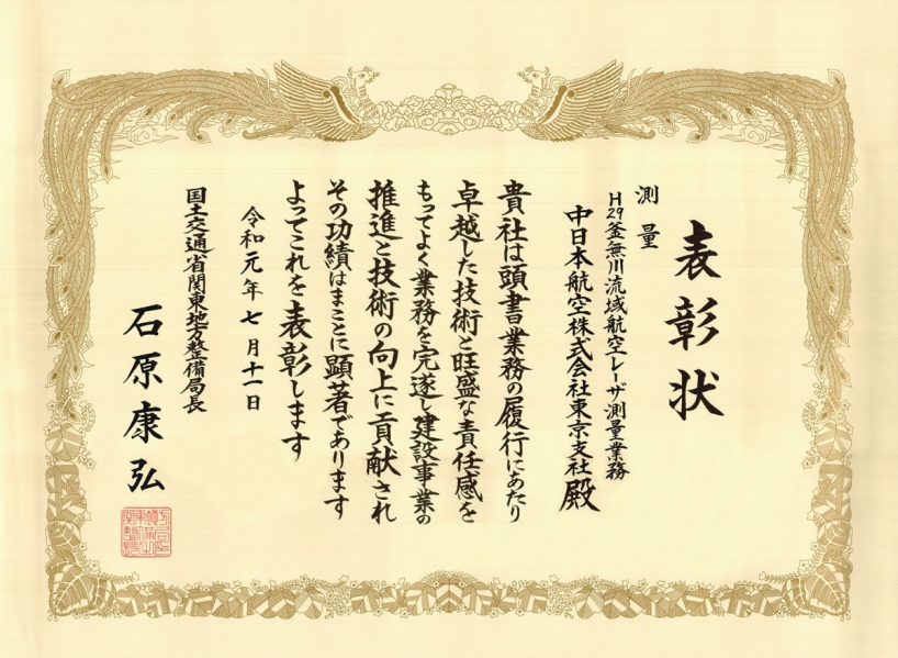 201907/12Fri 表彰 中日本航空の取り組み H29釜無川流域航空レーザ測量業務で優良業務表彰および優秀技術者表彰をいただきました このたび「H29釜無川流域航空レーザ測量業務」で、国土交通省 関東地方整備局より優良業務表彰および優秀技術者表彰をいただきました。 これは、弊社が業務の履行にあたり、卓越した技術と旺盛な責任感をもってよく業務を完遂し、建設事業の推進と技術の向上に貢献したことによるものです。