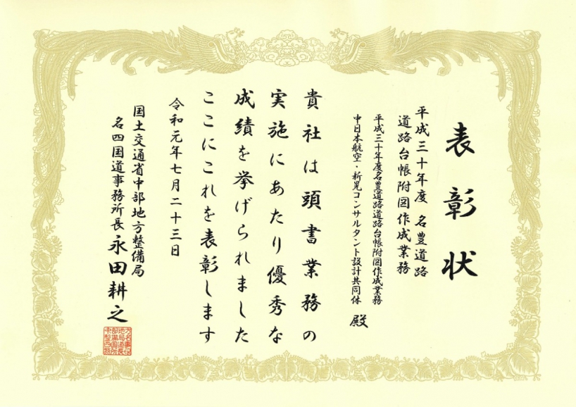 201907/24Wed 表彰 中日本航空の取り組み 平成30年度 名豊道路 道路台帳附図作成業務で優良業務表彰をいただきました このたび「平成30年度 名豊道路 道路台帳附図作成業務」で、国土交通省中部地方整備局 名四国道事務所より優良業務表彰をいただきました。 これは、弊社が優秀な成績をもって業務を完了したことによるものです。