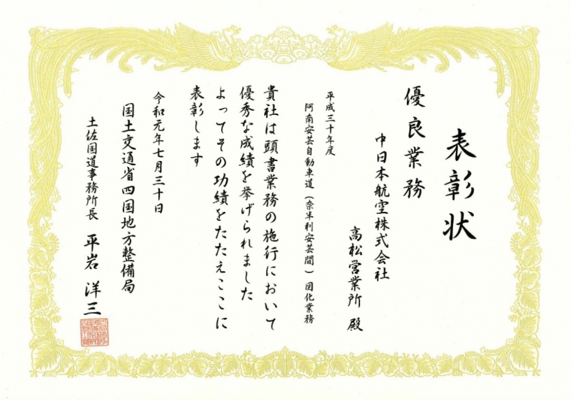 201907/31Wed 表彰 中日本航空の取り組み 平成30年度阿南安芸自動車道(奈半利安芸間) 図化業務で優良業務表彰および優秀建設技術者表彰をいただきました このたび「平成30年度 阿南安芸自動車道(奈半利安芸間) 図化業務」で、国土交通省四国地方整備局 土佐国道事務所長より優良業務表彰および優秀建設技術者表彰をいただきました。 これは、弊社が優秀な成績をもって業務を完了したことによるものです。