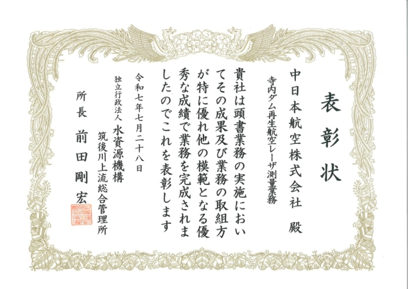 また「寺内ダム再生航空レーザ測量業務」で、独立行政法人水資源機構筑後川上流総合管理所より優良業務表彰をいただきました。