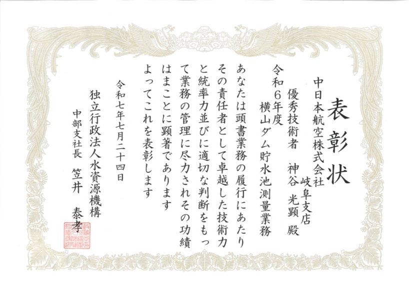 このたび「令和6年度横山ダム貯水池測量業務」で、独立行政法人水資源機構中部支社長より優良業務表彰および優秀技術者表彰をいただきました。