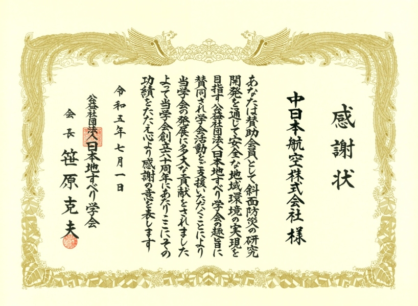 202308/09Wed 表彰 中日本航空の取り組み 公益社団法人日本地すべり学会より感謝状をいただきました このたび、公益社団法人日本地すべり学会創立60周年にあたり、同学会より感謝状をいただきました。 これは中日本航空の学会活動への貢献を評価していただいたものです。