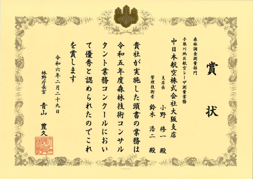 202403/06Wed 表彰 中日本航空の取り組み 手取川地区航空レーザ測量業務で林野庁長官賞をいただきました このたび林野庁近畿中国森林管理局から受託した「手取川地区航空レーザ測量業務」が、令和5年度森林技術コンサルタント業務コンクールにおいて林野庁長官賞を受賞しました。 これは、中日本航空の実施した業務が、森林技術コンサルタント業務として特に優秀であると認められたことによるものです。