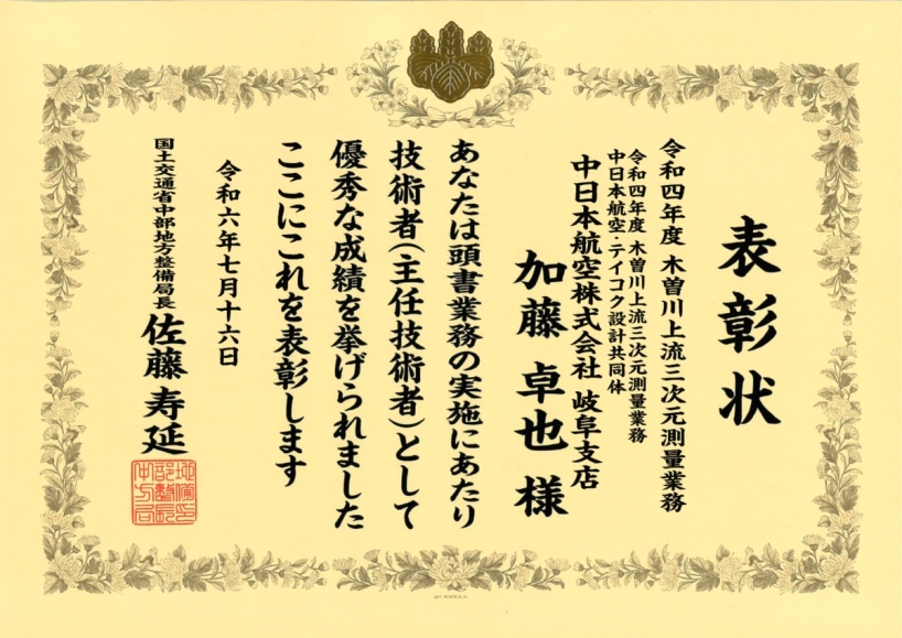 202408/02Fri 表彰 中日本航空の取り組み 令和4年度 木曽川上流三次元測量業務で優良業務表彰及び優良業務技術者表彰をいただきました このたび「令和4年度 木曽川上流三次元測量業務」で、国土交通省関中部地方整備局より優良業務局長表彰および優良業務技術者局長表彰をいただきました。 これは、中日本航空・テイコク設計共同体が業務の実施において、その成果及び業務への取り組み方が特に優れ、他の模範となる優秀な成績をもって業務を完了したことによるものです。