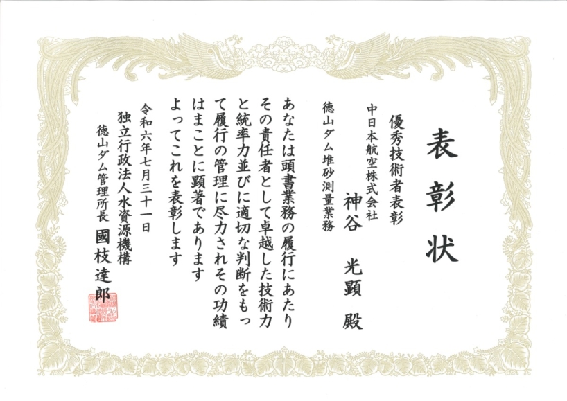 202408/05Mon 表彰 中日本航空の取り組み 徳山ダム堆砂測量業務で優良業務表彰及び優秀技術者表彰をいただきました このたび「徳山ダム堆砂測量業務」で、独立行政法人水資源機構徳山ダム管理所長より優良業務表彰および優秀技術者表彰をいただきました。 これは、中日本航空が本業務の実施において、その成果及び業務への取り組み方が特に優れ、他の模範となる優秀な成績をもって業務を完了したことによるものです。