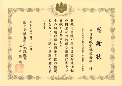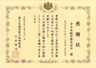202504/03Thu 表彰 中日本航空の取り組み 国土交通省国土地理院より感謝状をいただきました このたび、国土交通省国土地理院より感謝状をいただきました。 これは令和6年(2024年)1月1日に発生した能登半島地震において、当社が実施した下記の複数の災害対応を評価していただいたものです。 ・令和6年能登半島地震災害に伴う緊急撮影(輪島東地区) ・令和6年能登半島地震災害に伴う緊急撮影(穴水地区) ・能登半島地震に係る航空レーザ測量業務(能登中部地区)