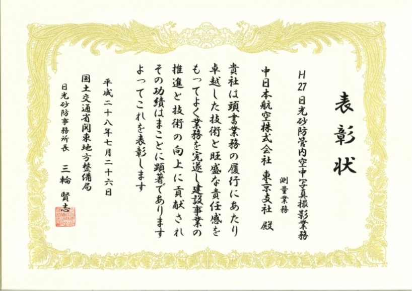 201607/27Wed 表彰 中日本航空の取り組み H27日光砂防管内空中写真撮影業務で優秀業務事務所長表彰および技術者事務所長表彰をいただきました このたび、H27日光砂防管内空中写真撮影業務で優秀業務事務所長表彰および技術者事務所長表彰をいただきました。 これは、弊社が業務の履行にあたり、卓越した技術をもって、建設事業の推進と技術の向上に貢献したことによるものです。