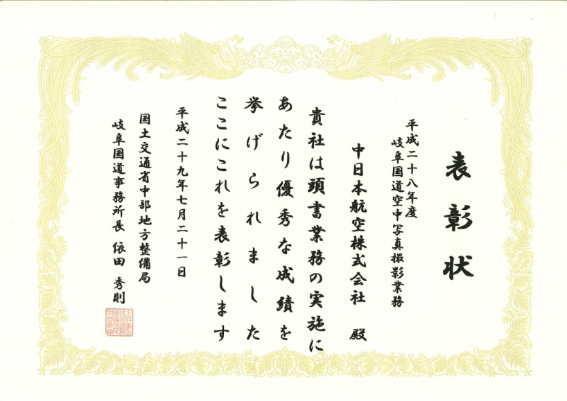 201707/24Mon 表彰 中日本航空の取り組み 「平成28年度 岐阜国道空中写真撮影業務」で優秀業務 事務所長表彰をいただきました このたび、「平成28年度 岐阜国道空中写真撮影業務」で、国土交通省 中部地方整備局より優秀業務事務所長表彰をいただきました。 これは、弊社が業務の履行にあたり、優秀なる成績をもって業務をを完了したことによるものです。