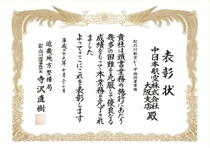 201707/28Fri 表彰 中日本航空の取り組み 「紀の川航空レーザ他測量業務」で優秀業務事務所長表彰および技術者 事務所長表彰をいただきました このたび、「紀の川航空レーザ他測量業務」で、近畿地方整備局より優良業務 事務所長表彰および技術者 事務所長表彰をいただきました。 これは、弊社が業務の履行にあたり、幾多の困難を克服し、優良なる成績をもって業務をを完了したことによるものです。