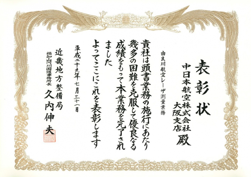 201708/01Tue 表彰 中日本航空の取り組み 「由良川航空レーザ測量業務」で優秀業務事務所長表彰および技術者 事務所長表彰をいただきました このたび、「由良川航空レーザ測量業務」で、近畿地方整備局より優良業務 事務所長表彰および技術者 事務所長表彰をいただきました。 これは、弊社が業務の履行にあたり、幾多の困難を克服し、優良なる成績をもって業務をを完了したことによるものです。