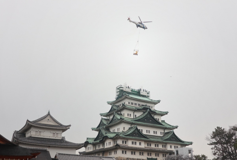 本日、名古屋城天守閣に鎮座する金の鯱 通称「金しゃち」を16年ぶりに地上へ降ろす作業を行いました。