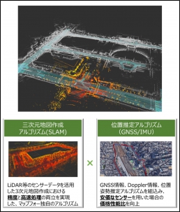 高精度かつ高速での情報処理を可能とするSLAM(Simultaneous Localization and Mapping) と低価格GNSS/IMUを用いた複合航法システムを組み合わせた三次元地図作成ソフトウェア。(右下図)