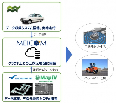 株式会社マップフォー(本社:名古屋市中村区、代表取締役社長:橘川 雄樹)、名古屋鉄道株式会社(本社:名古屋市中村区、代表取締役社長:安藤隆司)、中日本航空株式会社(本社:愛知県豊山町、代表取締役社長:柴田 拓)、株式会社メイテツコム(本社:名古屋市中村区、代表取締役社長:犬塚一広)、名鉄タクシーホールディングス株式会社(本社:名古屋市中川区、代表取締役社長:河原英穂)の5社は、名鉄タクシーホールディングス(株)が所有するタクシー車両を活用して高精度三次元地図(※1)を作成する実証事業を実施します。