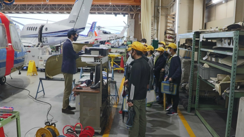 「会社・職業案内」では、当社事業内容と各職種の仕事内容などのご説明、「格納庫見学」では、H1棟(新第1格納庫)と第2格納庫をそれぞれ見て回り、ヘリコプターや飛行機の機種ごとの違いを観察したり、実際に乗ったりしながら、職場風景をご覧いただきました。