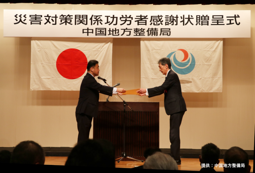 202303/29Wed 航空事業 災害対策関係功労者感謝状をいただきました 災害対策関係功労者感謝状贈呈式において、中国地方整備局長より感謝状をいただきました。 2022年(令和4年)9月の台風14号の接近に際し、迅速な人員配置により調査飛行を実施し、災害の拡大防止及び二次災害の未然防止に貢献したことによるものです。