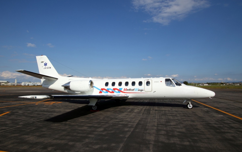 自治体主体の実用化は国内初となる北海道患者搬送固定翼機運航事業において、医療用小型ジェット機「メディカルウイング」の本格運航がスタートしました。運用は、「北海道航空医療ネットワーク研究会(HAMN=ハミン)」が北海道から受託し、機体は当社のセスナ560型サイテーションV及びビーチクラフト200型機キングエアにて運航しています。7月30日には、丘珠空港にて高橋はるみ知事や関係者による就航式を行いました。メディカルウィングは、広大な北海道において、高度・専門的医療の地位間格差を是正する目的があります。