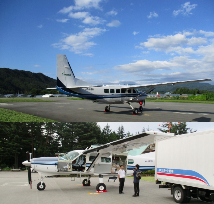 201709/01Fri 航空事業 飛騨の新鮮な農産物の空輸 8月31日、岐阜県の飛騨エアパークから当社セスナ208型キャラバン(JA818N)にて、新鮮な農産物約340㎏を空輸しました。これら農産物は、新宿のJA東京アグリパークで開催中の「JAひだ グルメ王国 飛騨まるごとフェア」へ向けて出荷されたものです。 当日は、7時20分に飛騨エアパークを離陸、同45分に富山空港に着陸しました。その後農産物は、ANA便にて羽田空港を経由して14時5分にJA東京アグリパークに到着しました。