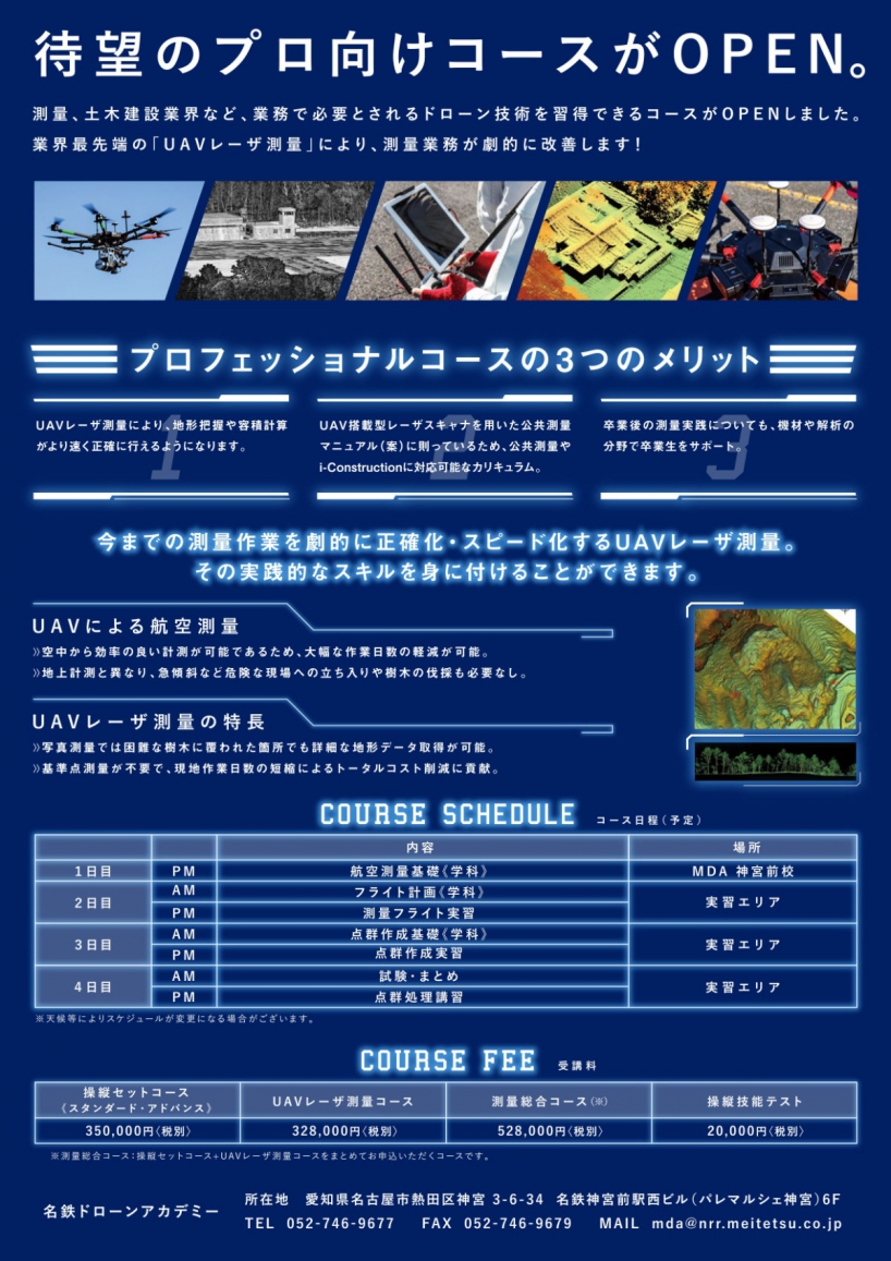 名古屋鉄道(株)が開講している名鉄ドローンアカデミー(MDA) プロフェッショナルコースでは、「UAV搭載型レーザスキャナを用いた公共測量マニュアル(案)」(令和2年3月改正:国土交通省国土地理院 発行)に準じたUAVレーザ測量を学ぶことができます。