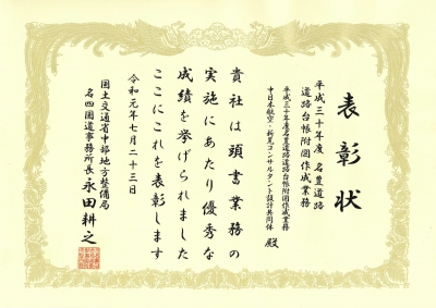 これは、弊社が業務の実施において、その成果および業務への取り組み方が特に優れ、他の模範となる優秀な成績をもって業務を完了したことによるものです。