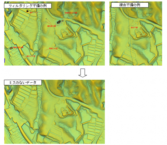 ★地形起伏図は成果としてだけではなく、フィルタリング作業や既存成果との接合処理における点検資料として使用できます。 ★可視化した画像は、フィルタリング時の処理エラーや接合不備を視覚的に表現でき、不備のない地形データを作成する際に利用できます。 ※画像は、クリックで拡大できます。 |