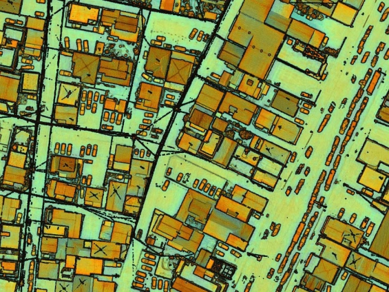 高度な表面抽出・内挿補間によって、離散的な点群からより高解像度のラスタデータに変換します。電線、建物、樹木などがゆがみなく表示されているため、画像をトレースする作業も簡単に行うことができます。 |