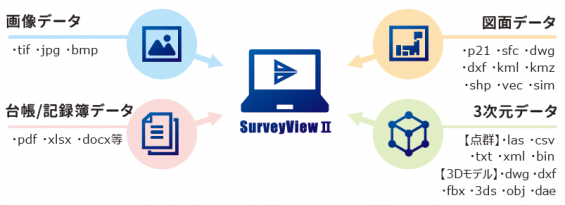 測量成果として一般的に使用されるファイル形式に対応しています。 特別な変換をすることなく、直接データを読み込むことができるため(ライセンス版のみ)、既成の3Dデータでも有効に活用できます。 ※画像はクリックで拡大できます。 |