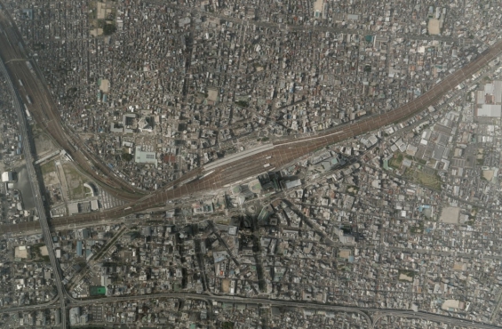 パンクロマティックセンサーは、高解像度のデータを取得することができますがモノクロ画像です。 一方、カラーレンズ群で取得した画像は、色情報があるため物体を識別しやすくなりますが、一般にパンクロマティック画像よりも低解像度です。 そこで、パンクロマティック画像にカラー画像を合成し、高解像度かつ多くの色情報を持たせるよう行う処理のことをパンシャープンと言います。 作成されたパンシャープン画像は、地形の判読、図面の背景などに活用されています。 |